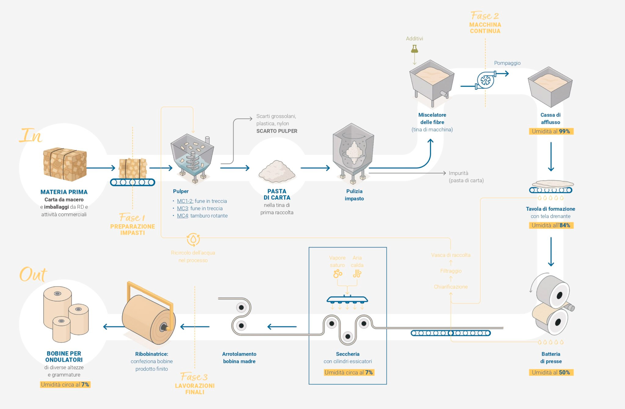 La materia prima, costituita da carta da macero e dal recupero di imballaggi provenienti, in genere, rispettivamente dalla raccolta differenziata e da attività commerciali, giunge allo Stabilimento imballata su camion o sciolta e viene depositata sui piazzali di stoccaggio.
